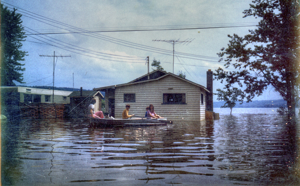 On June 14, 1972, Hurricane Agnes formed over the Yucatan Peninsula in Mexico. After leaving a trail of destruction in Mexico, and the Florida Panhandle, it moved out over the Atlantic ocean, gained strength, and then turned and made landfall again in New York City. The effects in Pennsylvania and Southern New York were devastating. The Susquehanna River flooded, and the lake levels of Waneta and Lamoka rose by 10 feet. All of the lakeside homes and cottages were flooded for almost three days. The photo below shows the effects of the flood on Canal street on the northeast end of Waneta Lake. This "North End" community was began by Frank Cash in the early 1940's when the area was just a swamp. Frank and his brother Roy filled in part of the swamp and built the first cottages here. The Cash brothers sold other lots in the area which were eventually filled in and built upon, forming the North End community.
